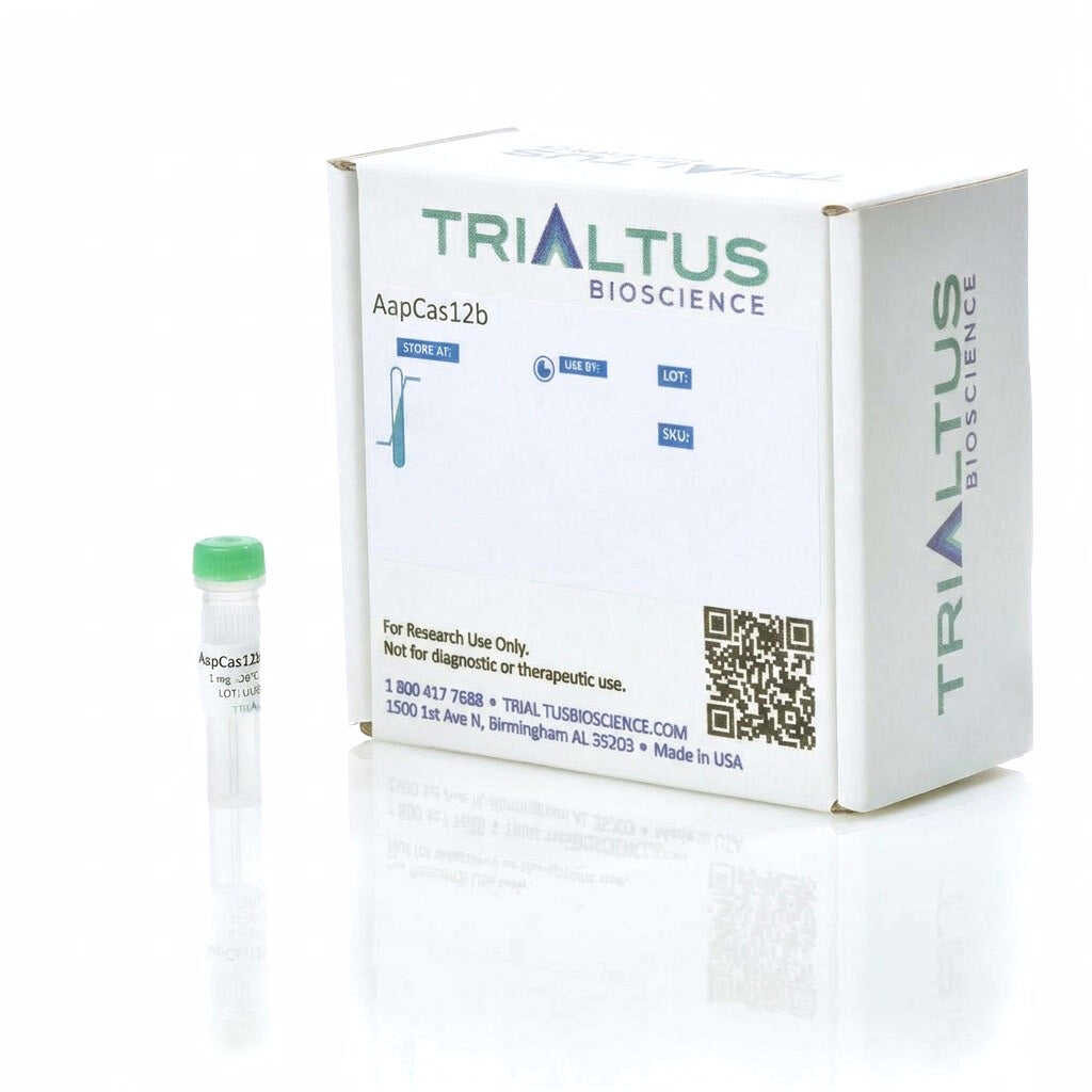 TriAltus' highly pure, tag-free Cas12b is used for genome editing with CRISPR technology and CRISPR-mediated in vitro applications. Recombinant Alicyclobacillus acidiphilus Cas12b (AapCas12b) protein is expressed in E. coli and features two C-terminal nuclear localization signals (NLS). AapCas12b protein combines with guide RNA (gRNA) to form a stable ribonucleoprotein (RNP) complex that enables the inactive nuclease to be guided to the specific double stranded DNA (dsDNA) site. Once guided to the specific cleavage site, AapCas12b becomes activated to specifically and precisely cleave the dsDNA and to indiscriminately trans-cleave single stranded DNA (ssDNA) nearby.